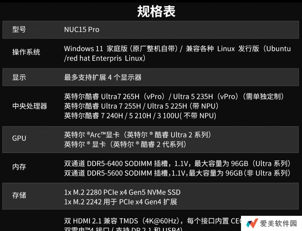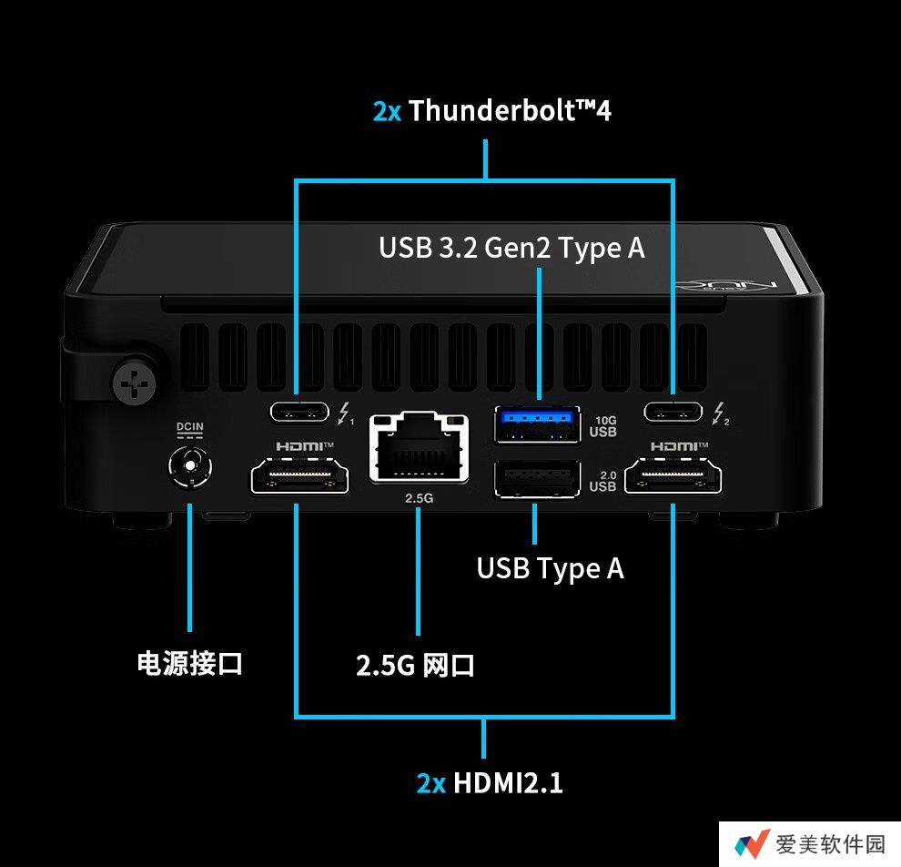 该机搭载最新的英特尔酷睿 Ultra 处理器,拥有高达 83 TOPS(本站注:每秒万亿次运算)的算力,支持 96GB 的双通道 DDR5-6400 内存,提供双 M.2 硬盘位(2242 PCIe 4.0*4 + 2280 PCIe 5.0*4)。