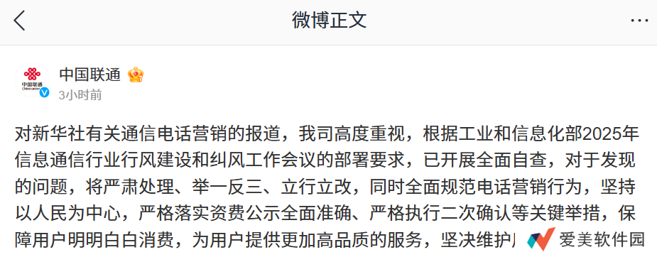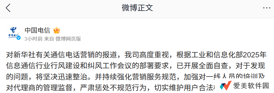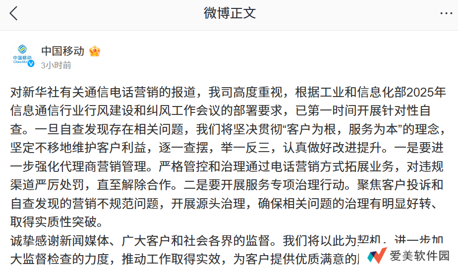 对新华社有关通信电话营销的报道,我司高度重视,根据工业和信息化部 2025 年信息通信行业行风建设和纠风工作会议的部署要求,已开展全面自查,对于发现的问题,将严肃处理、举一反三、立行立改,同时全面规范电话营销行为,坚持以人民为中心,严格落实资费公示全面准确、严格执行二次确认等关键举措,保障用户明明白白消费,为用户提供更加高品质的服务,坚决维护用户合法权益。