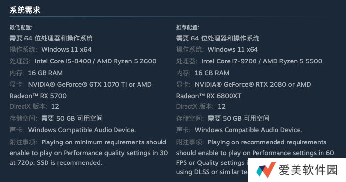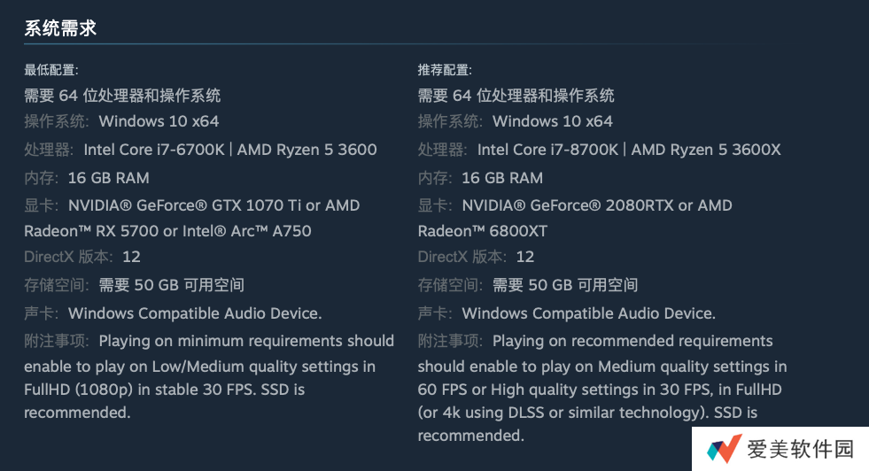 附注事项:满足最低配置时,游戏可在性能模式设置下以 30 帧,720P 运行。建议使用 SSD 硬盘。