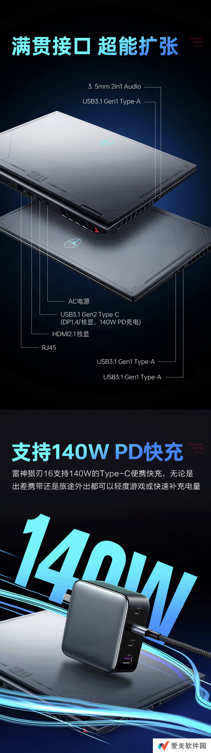 机器左侧配备1个 3.5mm音频接口、1个 USB-A 3.1 Gen 1 接口;右侧配备2个 USB-A 3.1 Gen 1接口;后侧配备1个 RJ45 接口、1 个 HDMI 2.1接口、1 个 USB-C 3.1 Gen 2接口。此外,该机支持140W USB-C PD 快充。