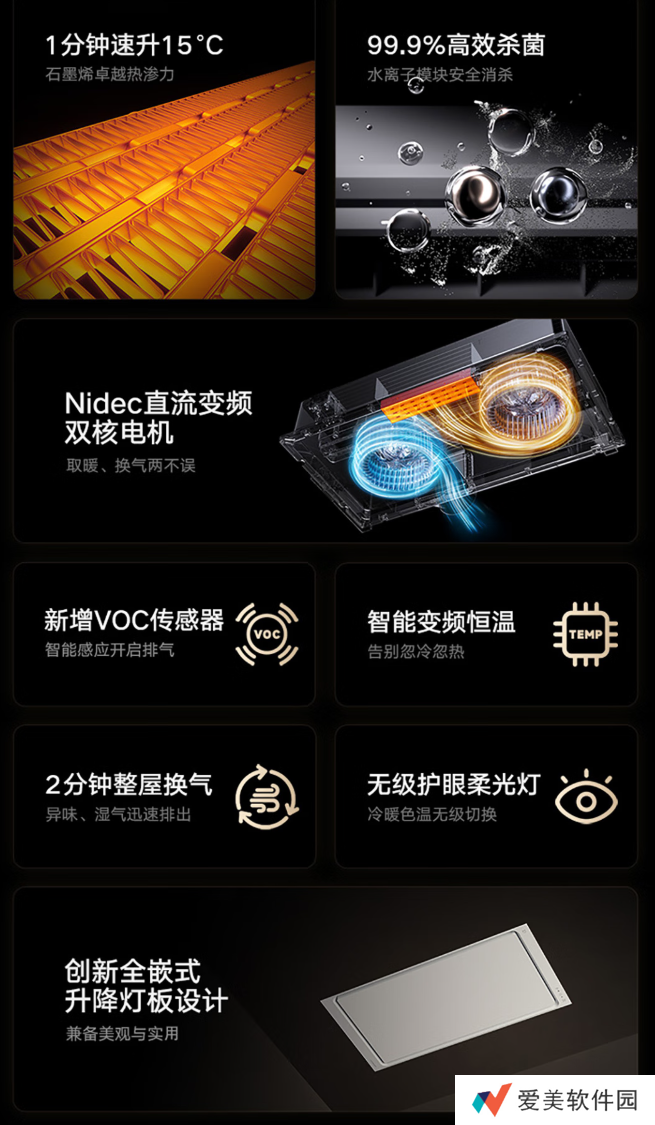 本站从商品页面获悉,该浴霸新升级全嵌式升降灯板,内置1400lm护眼柔光灯,支持2800-6000K冷暖色温无级调节,灯光显色指数 >95,RG0 级无蓝光危害。浴霸采用石墨烯速热科技,号称“1 分钟速升 15℃”,同时浴霸支持变频式恒温、摆动送风、立体循环加热。