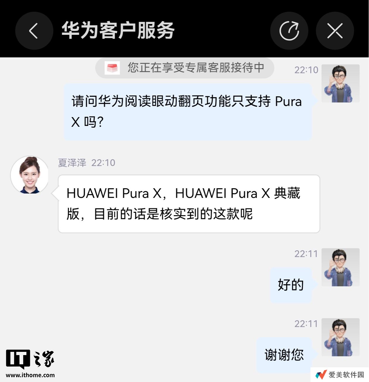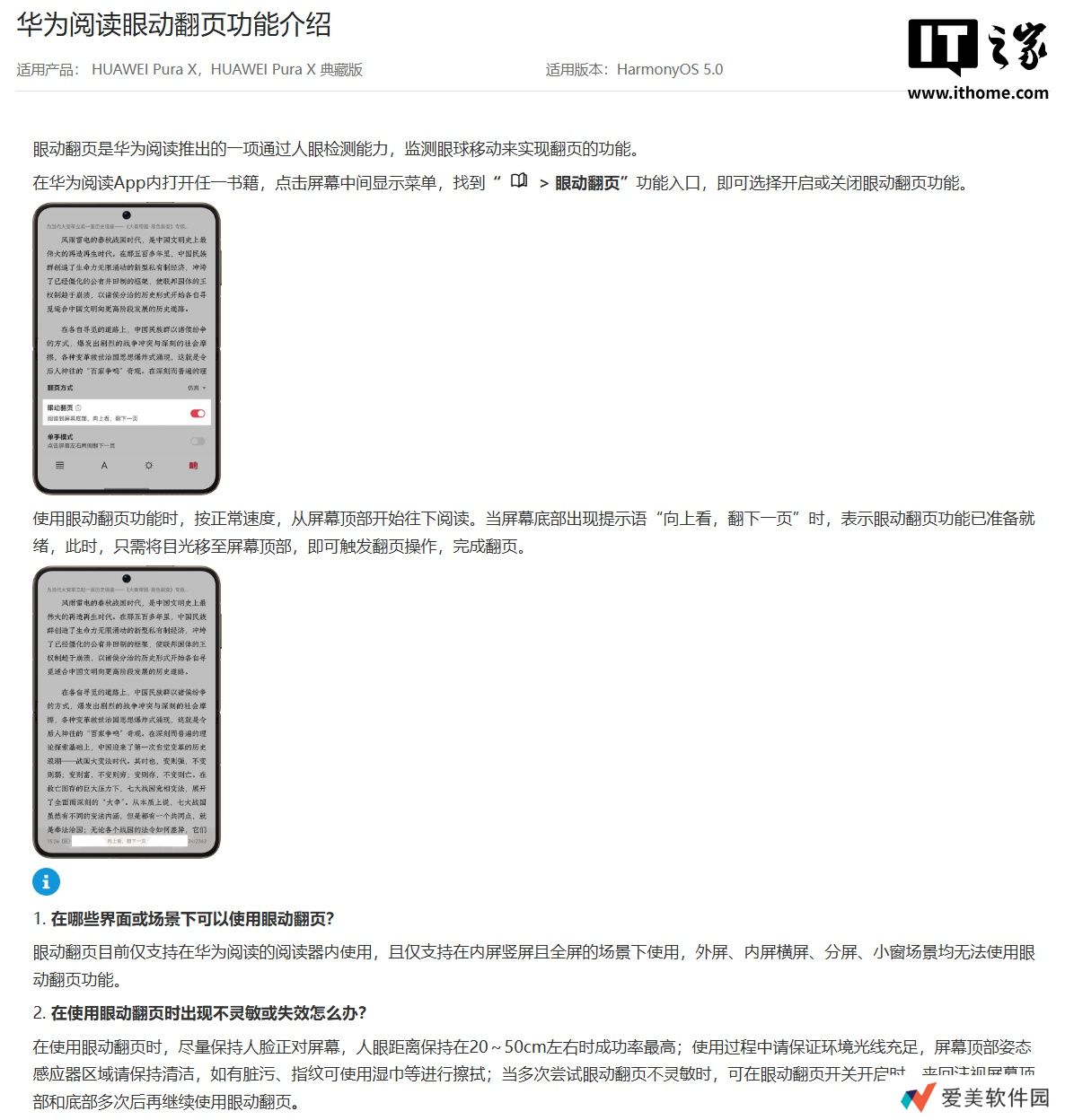 本站从华为客户服务和官网获悉,Pura X 系列阔折叠手机首发独占华为阅读眼动翻页功能。另外,该功能目前仅支持在华为阅读的阅读器内使用,且仅支持在内屏竖屏且全屏的场景下使用,外屏、内屏横屏、分屏、小窗场景均无法使用眼动翻页功能。