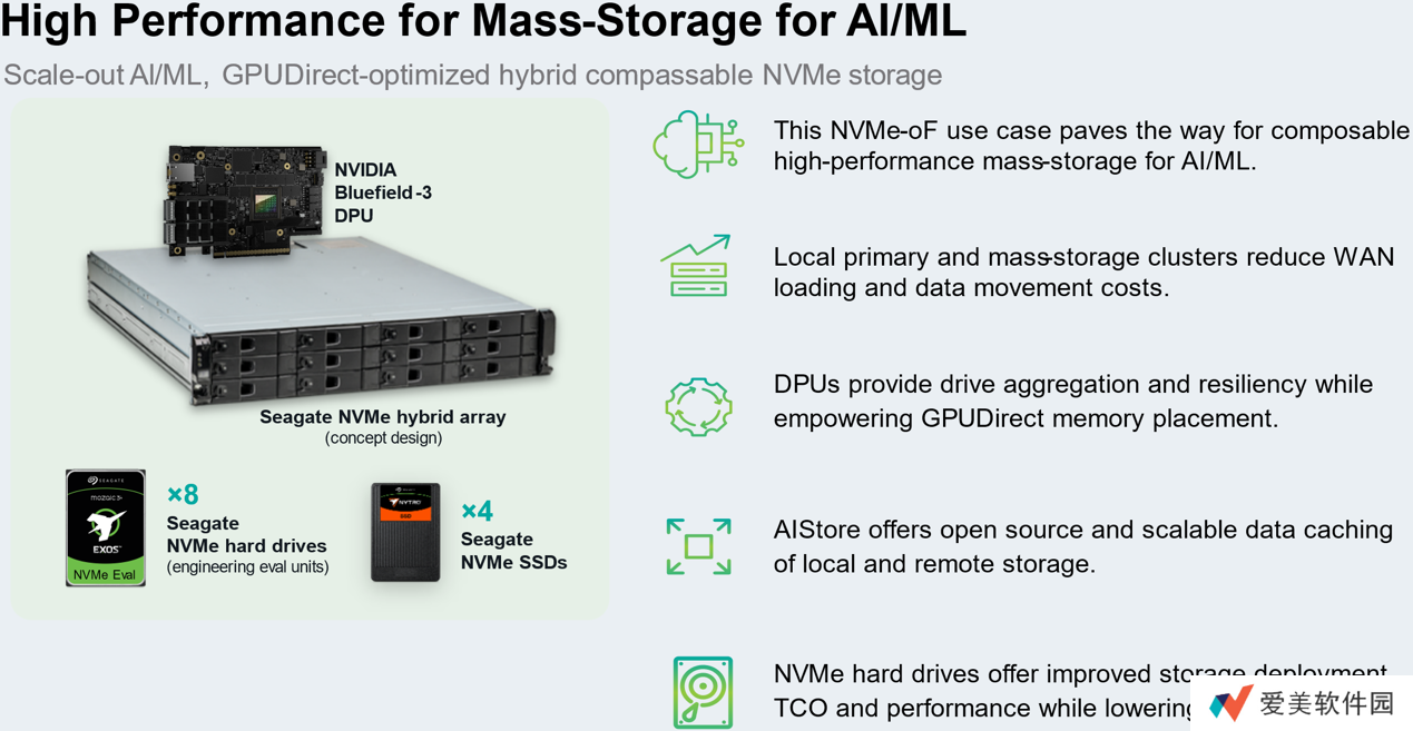 本站 3 月 21 日消息,希捷于今年 3 月 19 日的英伟达 GTC 2025 大会上与英伟达展示了一个概念验证系统,该系统搭载希捷的 NVMe 机械硬盘和 NVMe 固态硬盘与英伟达 BlueField 3 DPU(数据处理器),实现更高的吞吐量与更低的延迟。