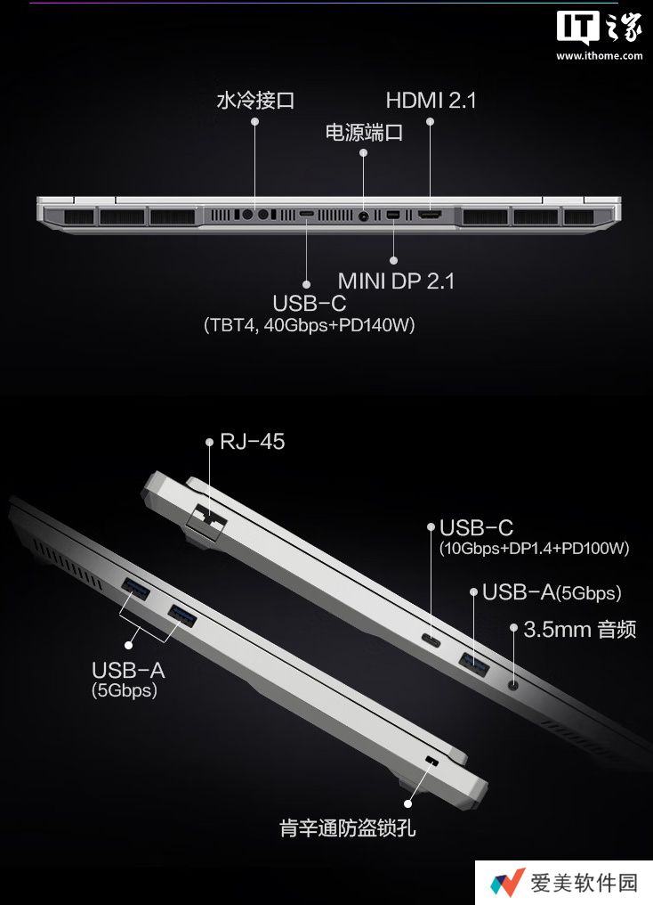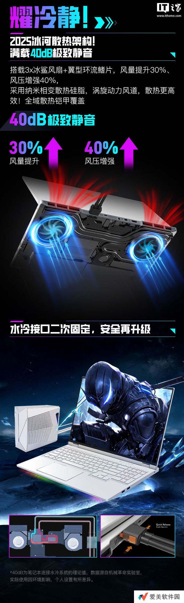 在散热方面,该机采用了相变硅脂+多热管+三风扇+外置水冷的散热组合,其风扇风量提升30%、风压增强 40%。在外接水冷系统时其支持合计300W双烤、GPU 175W满血释放,同时噪声低至40dB。