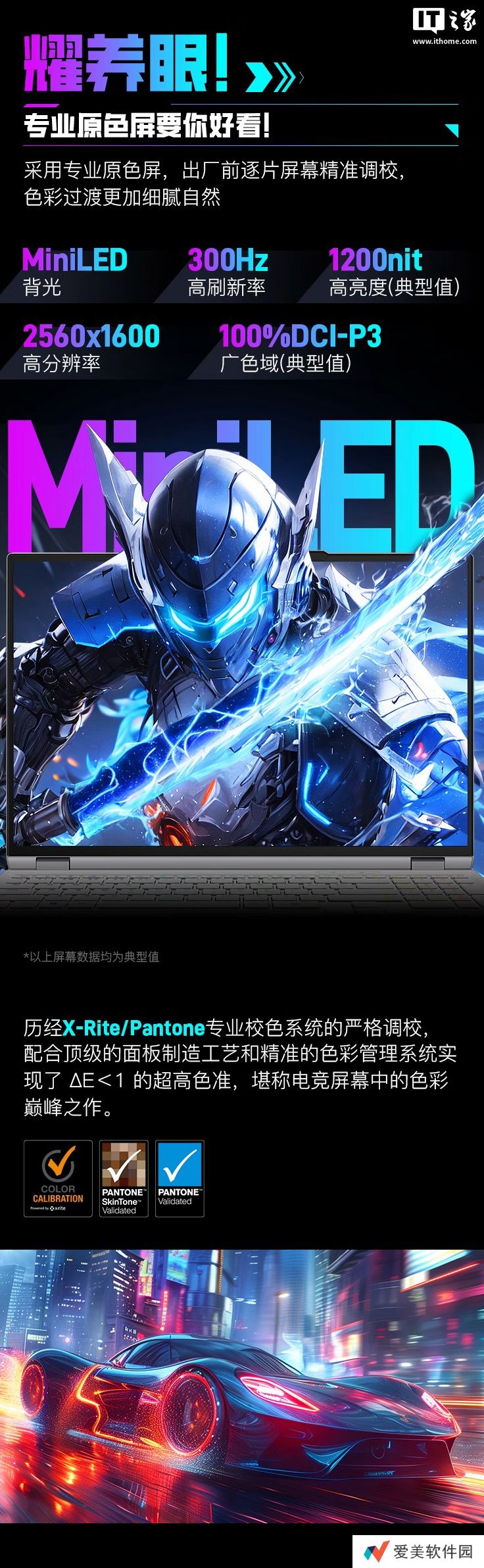 耀世16 Ultra搭载了一块16英寸2560×1600分辨率300Hz高刷新率的Mini LED面板,拥有1200尼特亮度,其色域覆盖达100% DCI-P3,同时色差ΔE<1。同时配备1080P IR红外摄像头。