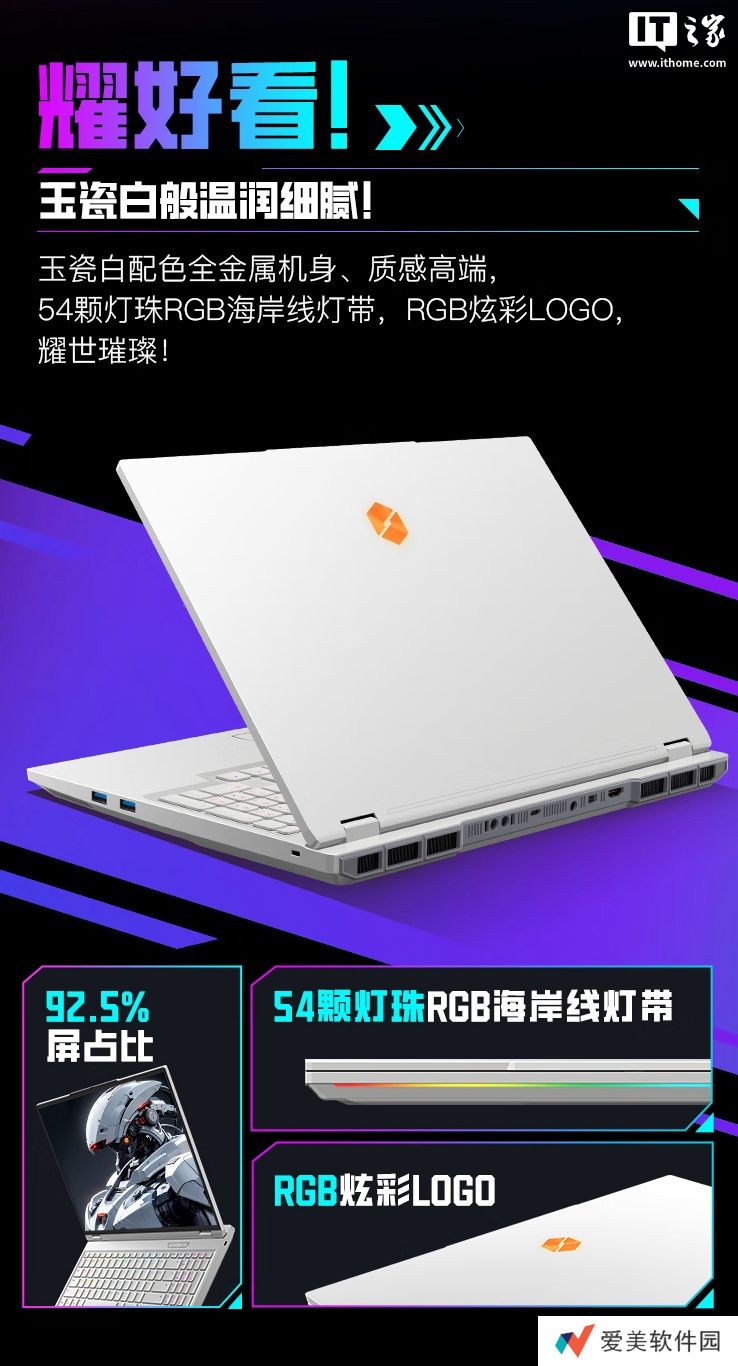 外观方面,该机整体采用“玉瓷白”配色全金属机身,拥有海岸线RGB LED灯带,其搭载具备单键RGB的 1.4mm键程剪刀脚键盘,配备微弧面人体工学键帽,触控板为AGC磨砂玻璃材质。