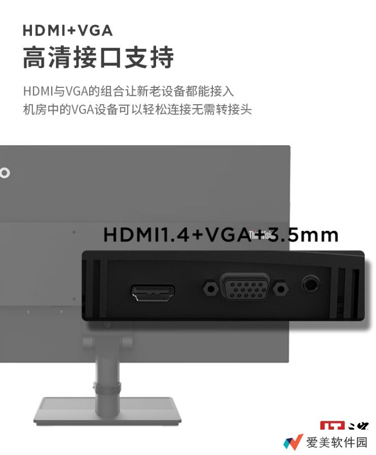 这款显示器支架支持俯仰,显示器本体支持VESA壁挂,提供1个 HDMI 1.4接口、1个 VGA接口、1 个 3.5mm音频接口。