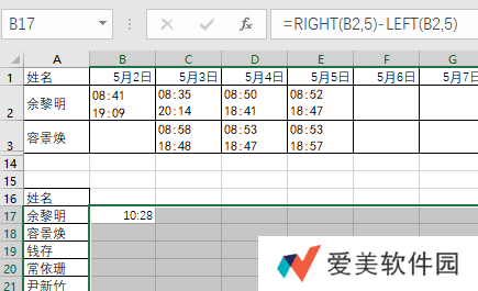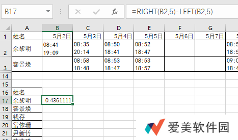 这就是「余黎明」5 月 2 日的工时,设置 B17:S28 的单元格格式为时间,可以更直观地看到: