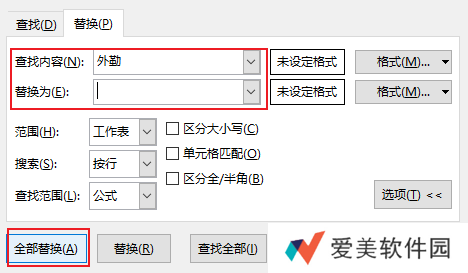 先利用查找替换去除文字「外勤」(记得先备份数据,以免丢失~):