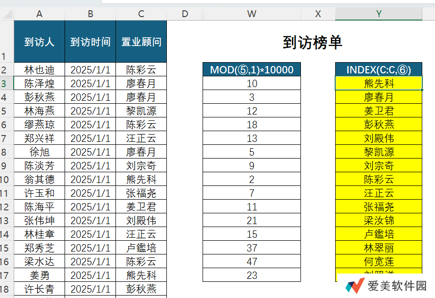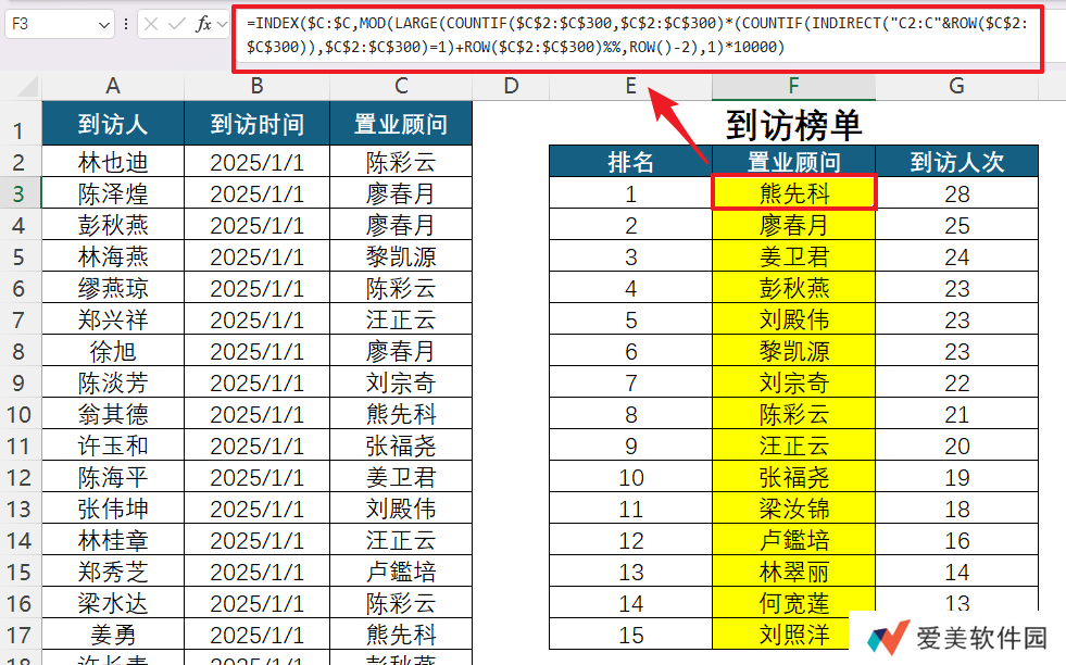 ❷ 人员是多次重复的,不同置业顾问的到访次数也可能是重复,但求值结果中的人名都必须是唯一的,公式需有去重功能;