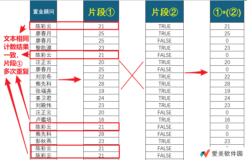 而②为逻辑数组,仅首次出现位置处为 TRUE(计算时为 1),其余为 FALSE(计算时为 0);