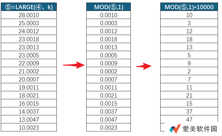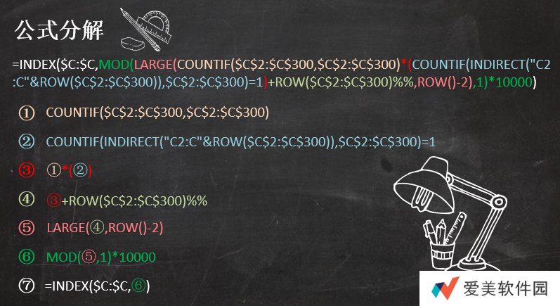 此处是对片段④的反运算,通过对 1 取余再乘以 10000,换算出被两个 %% 转化为小数的 ROW (C2:C300) 的行号值。