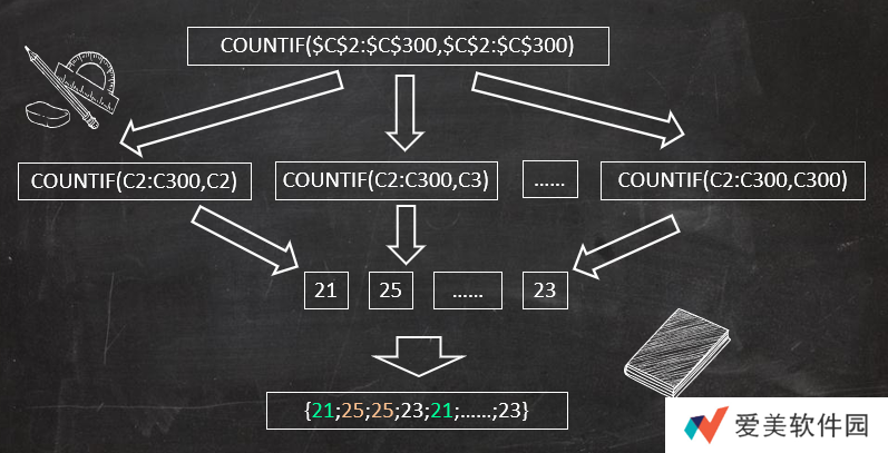 ❶ COUNTIF($C$2:$C$300,$C$2:$C$300)