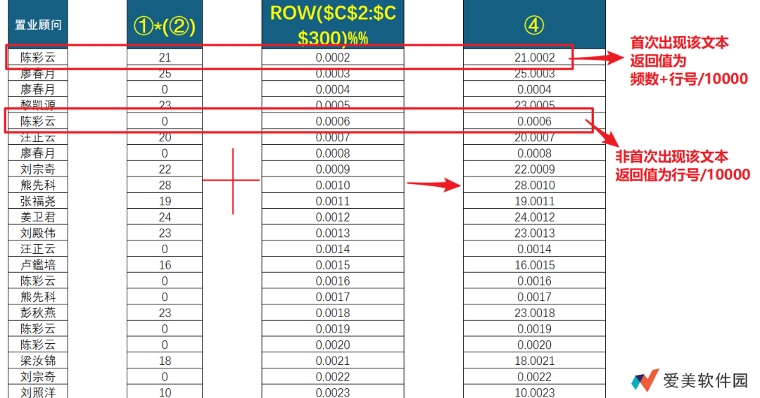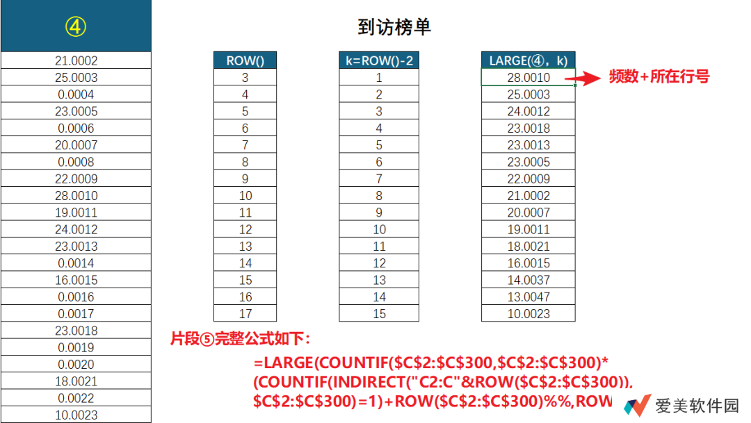 ROW (C2:C300) 返回一组行号值,两个 %% 等同于除以 10000,将它转化为小数,再与③相加,既不影响频数值之间的大小排序,又能指示当前值位置信息。