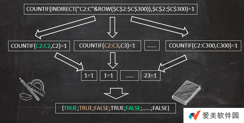❷ COUNTIF(INDIRECT("C2:C"&ROW($C$2:$C$300)),$C$2:$C$300)=1