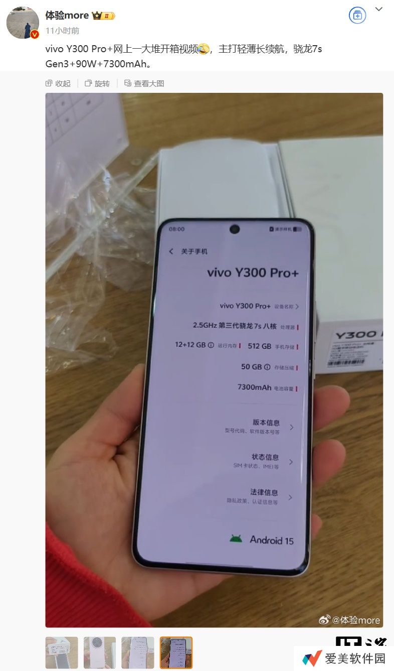 本站注意到,博主 @体验more 昨日晚透露了新机核心配置信息:vivo Y300 Pro+ 主打轻薄长续航,其搭载高通骁龙 7s Gen3 处理器、内置 7300mAh 电池(支持 90W 快充)、提供 12GB+512GB 版本。