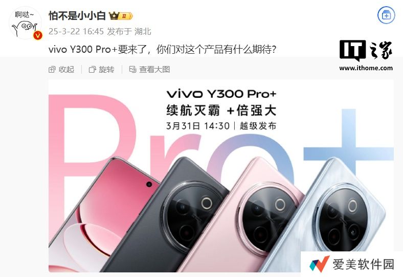 本站 3 月 24 日消息,vivo Y300 Pro+ 手机已在网络上曝光,相关信息显示,新机将于 3 月 31 日 14:30 发布。