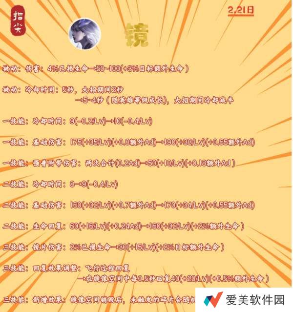 被动技能大招期间冷却减半,且后期降低技能冷却,三个技能的数值全部重新调整,加强基础和成长伤害,削弱AD,降低镜纯输出的高爆发,鼓励走半肉流的玩法。