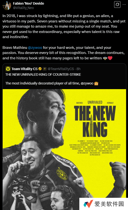 Vitality俱乐部首席执行官Neo在个人社交媒体账号上发文盛赞了队内明星选手ZywOo。