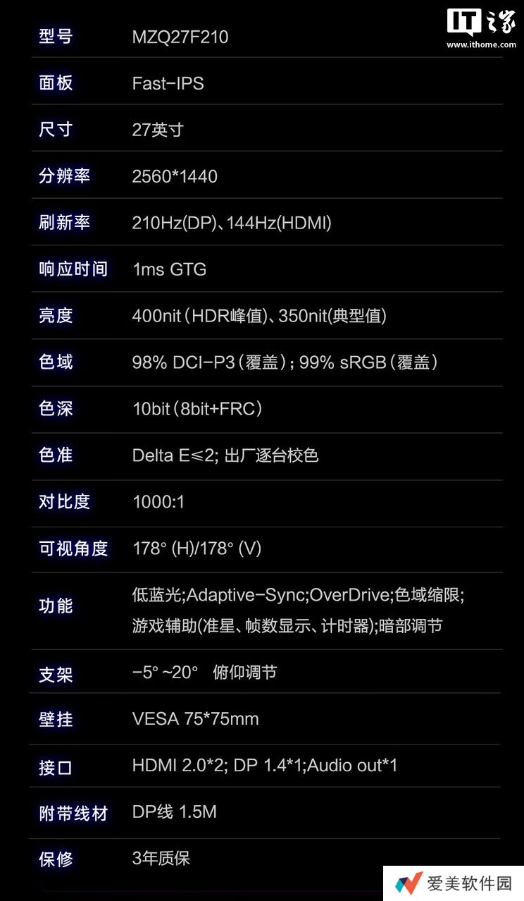 这款显示器配备一块2560x1440分辨率210Hz超频Fast IPS面板,其中DP下刷新率可达210Hz,HDMI下刷新率144Hz,显示器 GtG响应速度1ms,典型亮度350尼特,峰值亮度400尼特,静态对比度1000:1,显示器支持10-Bit色彩(8-Bit + FRC),覆盖98% DCI-P3和99% sRGB色域。