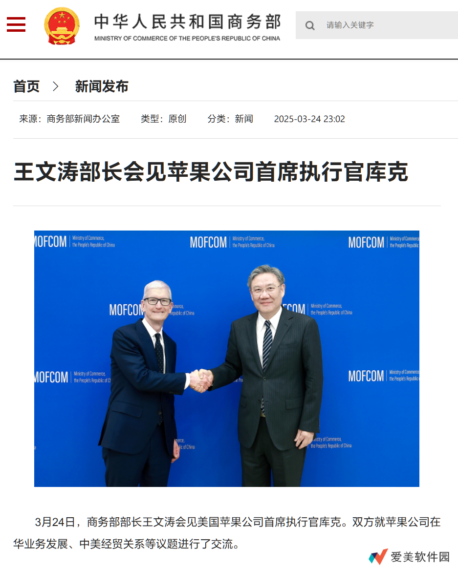 本站 3 月 24 日消息,本站从商务部网站获悉,商务部部长王文涛会见美国苹果公司首席执行官库克、高通公司总裁兼首席执行官安蒙。王文涛分别与库克、安蒙就苹果公司、高通公司在华业务发展、中美经贸关系等进行交流。