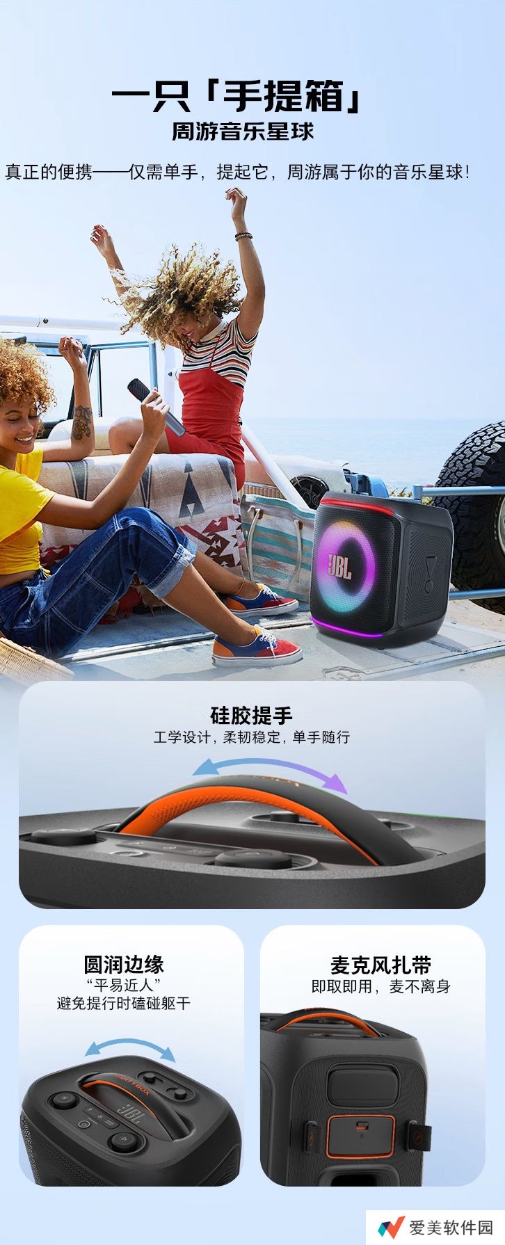 外观方面,这款音箱拥有24色可调节拍灯,支持根据歌曲匹配灯效,增加动感效果。音箱配备硅胶提手,号称“单手即可拎起”。