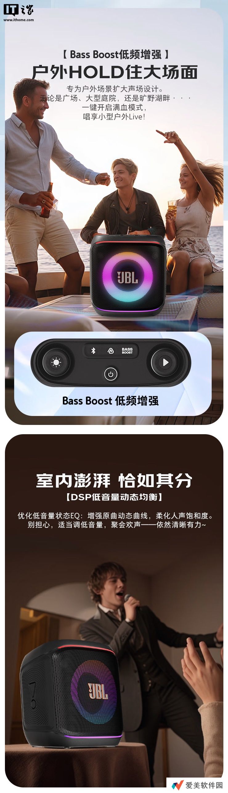 该音箱拥有100W RMS峰值功率,支持Bass Boost低频增强技术,同时还支持DSP低音量动态均衡技术。音箱内置JBL派对音效,同时可匹配 JBL 麦克风实现开机自联一键K歌功能。
