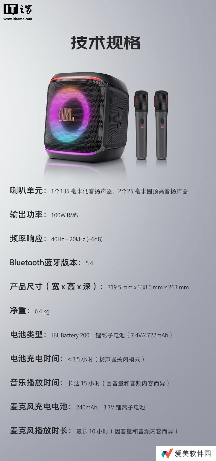 此外,这款音箱拥有IPX4防水等级,支持通过App调参,音箱内置蓝牙5.4技术,支持双设备组建立体声,音箱内置 4722 毫安时电池,续航至高15小时。