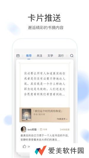 精心配色,满足视觉需求。书摘以卡片为载体,极简新趣,上下滑动切换流书,左右滑动跳转栏目,方便快速浏览自己感兴趣的内容;