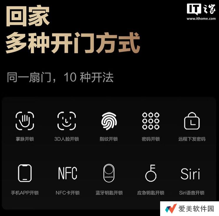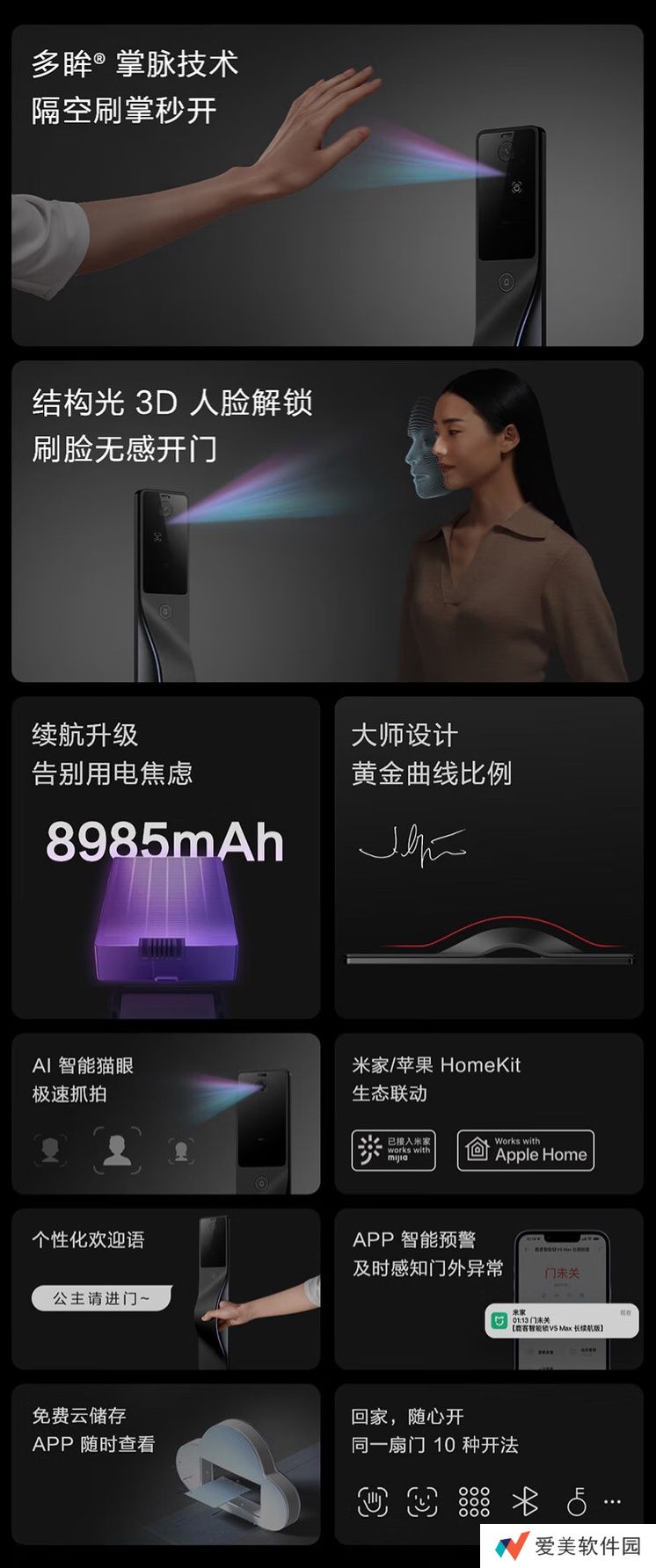 该门锁应用了多眸掌静脉识别技术,同时配备结构光3D解锁,其他方面还支持指纹开锁、密码开锁、手机App开锁、NFC卡开锁、蓝牙钥匙开锁、Siri语音开锁、应急钥匙开锁。