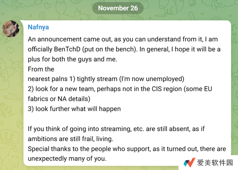 “大家好,我需要写点实质性的东西,因为我已经很久没有写过任何有意义的东西了。首先,我想说的是感谢战队和与我一起比赛的选手们,我们有快乐的时刻,也有困难的时刻,尽管艰难险阻,但我们还是挺了过来。我相信在过去的一年里我有不小的成长,这在赛季后半段的许多赛事中都很明显。赛季末期是一段非常艰难的时期,尤其是在亚特兰大的赛事之后,很多角色和分工都发生了变化,这对我个人、我的表现以及队伍都产生了影响。