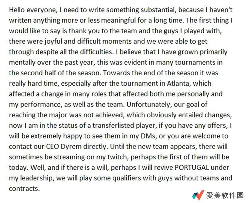不幸的是,我们未能实现进入Major的目标,这显然需要做出改变,现在我的身份是一名转会名单上的选手。如果您有任何offer,我将非常乐意在私信中查看,或者欢迎您直接联系我们的首席执行官Dyrem。在加盟新队伍之前,我会偶尔进行直播,也许今天会是第一次。另外如果有意愿的话,也许我会作为指挥重振葡萄牙CS,我们会和没有队伍和合同束缚的选手打一些预选赛。”
