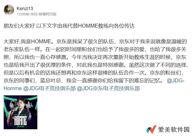 直播吧11月27日讯 英雄联盟冬季转会期正在进行中,今日韩媒记者代HOMME教练传达信息,其文中表示今年HOMME将重新开始教练生涯,并感谢京东开除的丰厚条件,但这次做了不同的选择,以后有机会想再和京东这样很棒的队伍合作一次。