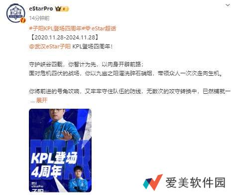 虎扑11月28日讯 子阳登场KPL四周年,ES发文:是你,带领众人一次次走向生机