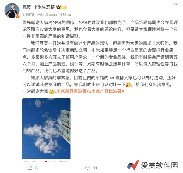 陈波强调,小米对待每一个新品类都会深入挖掘行业痛点,并通过多渠道了解用户需求。他表示,NAS作为一个专业性非常高的产品,其制造周期相对较长。因此,他希望大家能够理性对待,并耐心等待产品的问世。