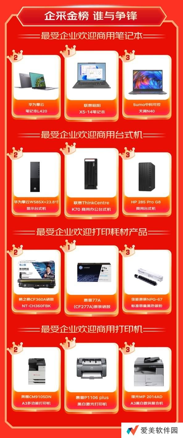 此次活动中,还涌现出了多款备受欢迎的商用3C数码产品。联想昭阳X5-14笔记本电脑、联想Thinkcentre K70商用办公台式机、惠普77A(CF277A)原装硒鼓以及惠普P1106 plus黑白激光打印机等产品均受到了企业用户的青睐。
