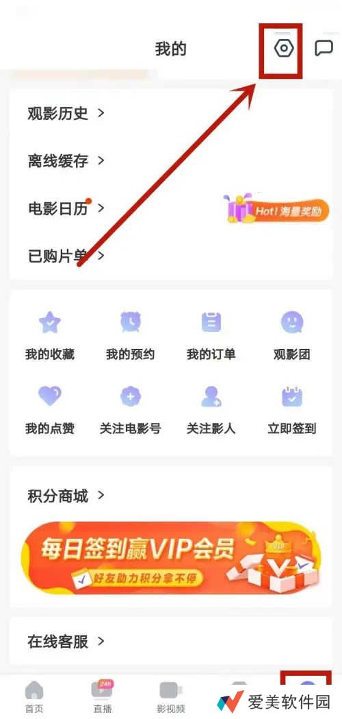 手机1905电影网软件,点击右下角我的,选择右上角设置项目。