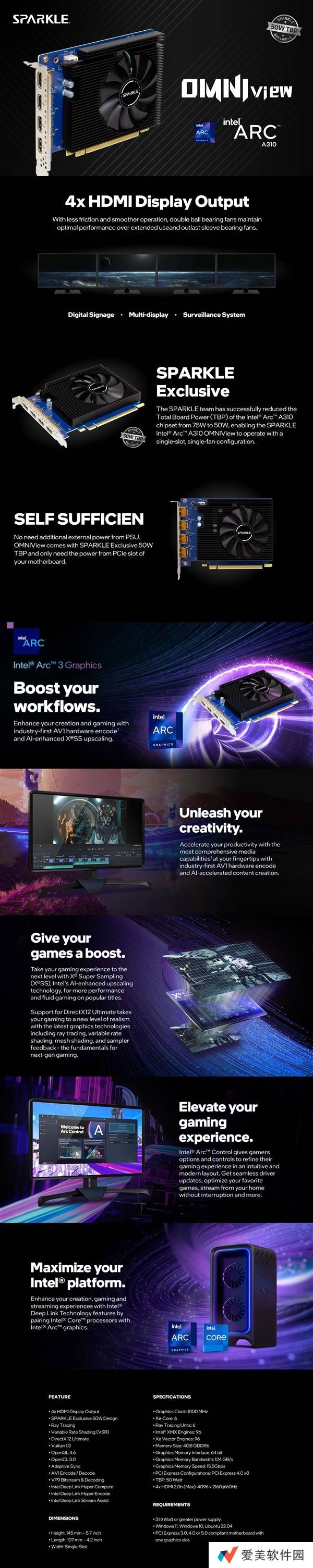 A310 Omni View并非面向游戏玩家,而是一款专为视频输出设计的显卡。它配备了四个HDMI 2.0b接口,能够同时连接四台高清显示器,且每台显示器都支持4K60Hz分辨率,满足多屏用户的需求。