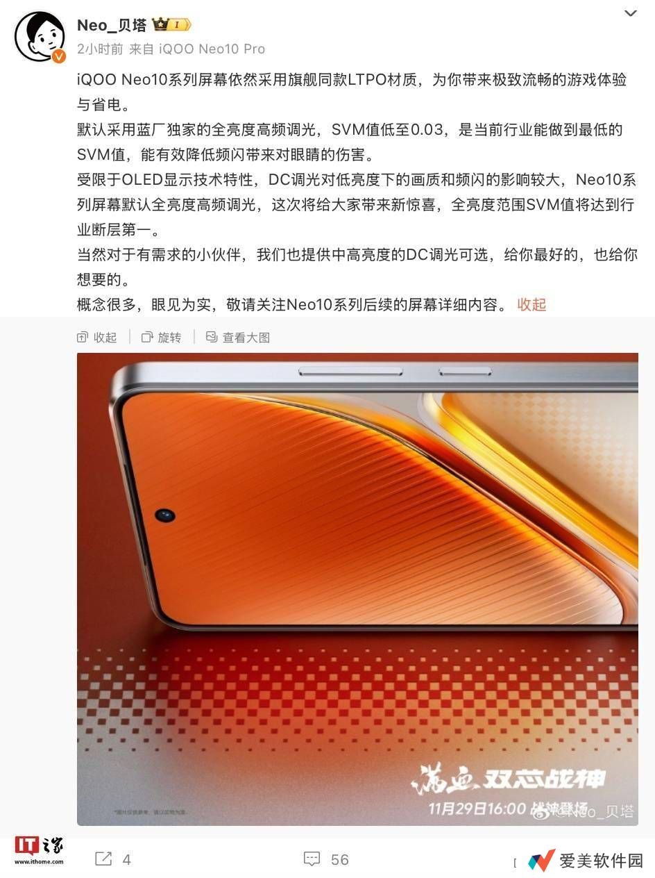 据透露,iQOO Neo10系列将配备旗舰级的LTPO屏幕材质,并默认搭载iQOO独有的全亮度高频调光技术。这项技术的SVM值低至0.03,据称是当前行业内最低的SVM值,旨在有效减轻频闪对眼睛的潜在伤害,为用户带来更为舒适的视觉体验。
