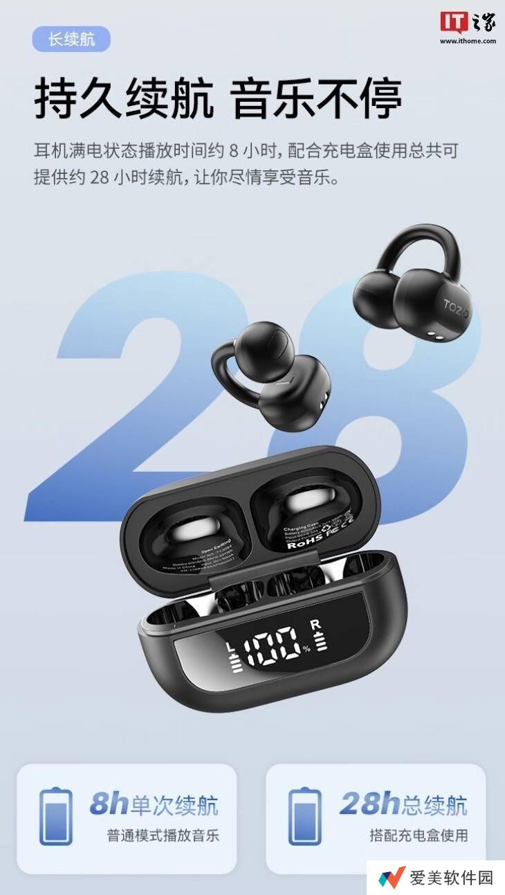 从规格上来看,这款耳机配备了12mm的动圈单元,音质表现尤为出色。它还支持定向传声技术,能够确保声音清晰、准确地传递到用户的耳中。Open EarRing还自带ENC通话降噪功能,即使在嘈杂的环境中,也能保证通话的清晰度和质量。在续航方面,单耳机续航时间长达8小时,配合充电盒使用,总续航时间更是高达28小时,满足了用户长时间使用的需求。