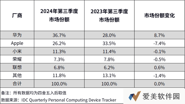 苹果平板电脑虽然依旧保持强劲,但市场份额为26.2%,位居华为之后。受国产产品激烈竞争、高价策略及渠道库存等多重因素影响,苹果三季度出货量呈现同比下滑趋势。