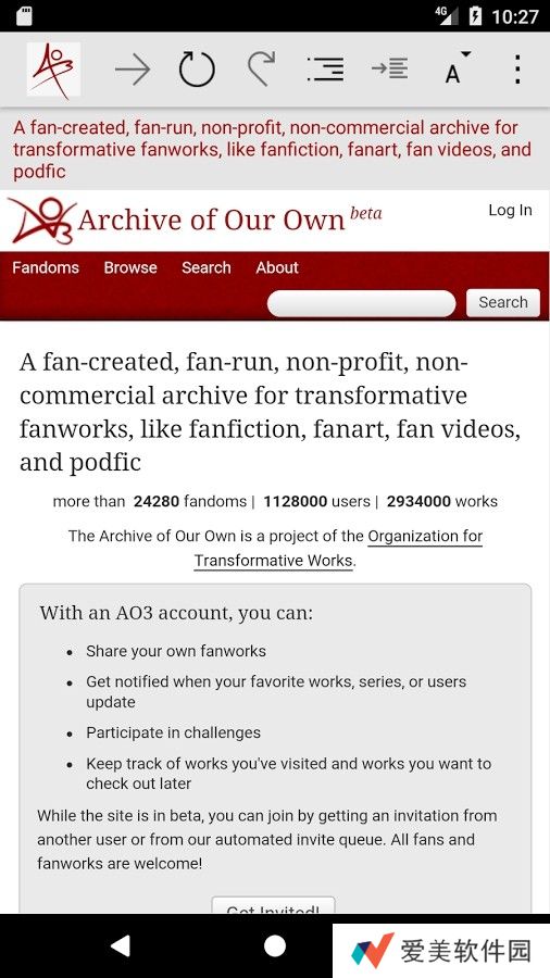 又称凹3,是一个同人创作平台,界面是全英文的,对于文章内容有详细分层,包括是否适合未成年人阅读,是否有暴力行为,是否有主要人物死亡等等。