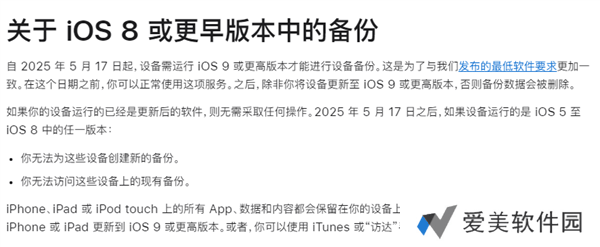苹果公司近日发布了一项关于设备备份的新政策,该政策将自2025年5月17日起正式生效。根据公告,届时只有运行iOS 9或更高版本的设备才能享受iCloud备份服务。