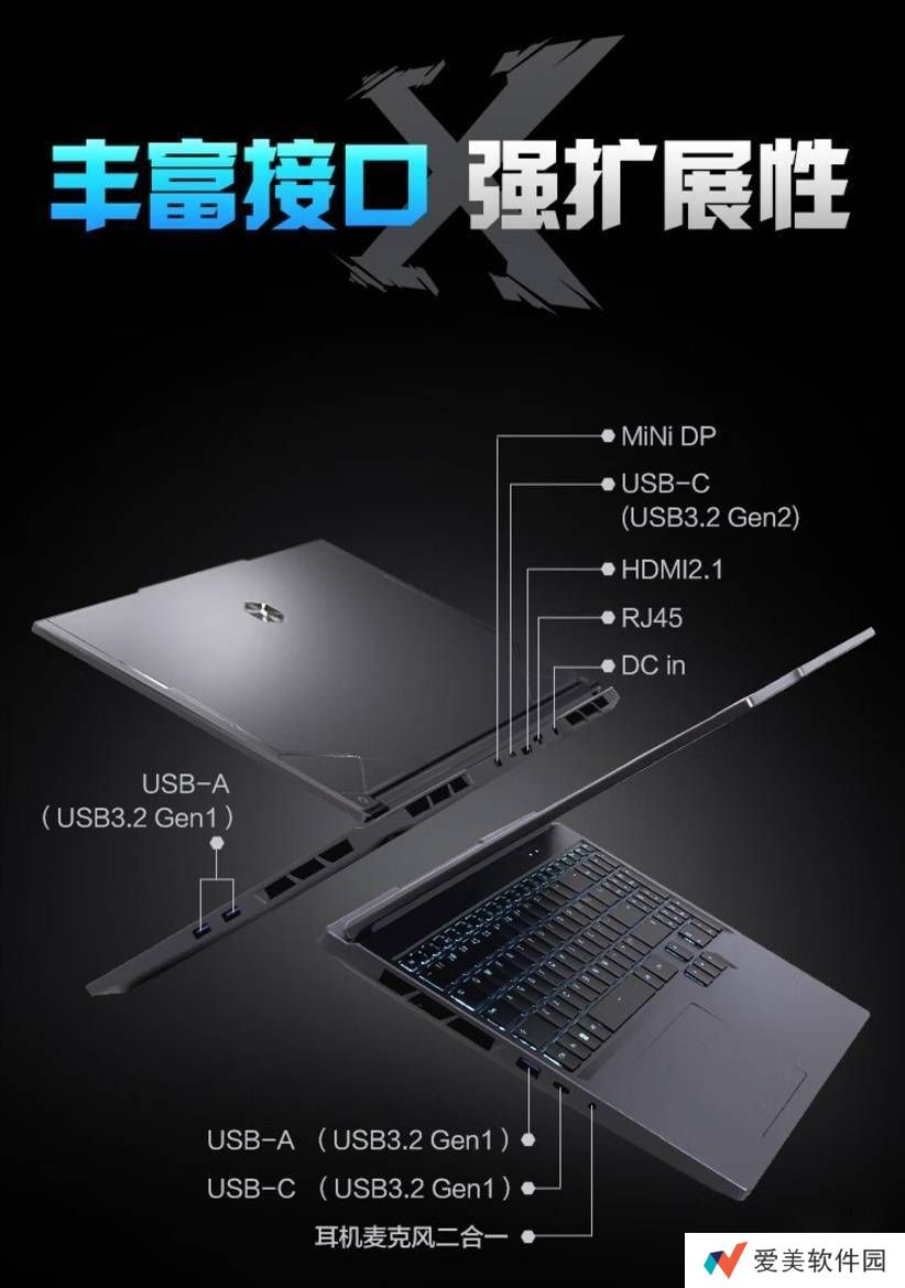 在接口方面,极光X游戏本同样表现出色。它配备了多个USB接口、Mini-DP接口、HDMI 2.1接口、RJ45接口、DC in接口以及耳机麦克风二合一接口,满足了用户各种连接需求。