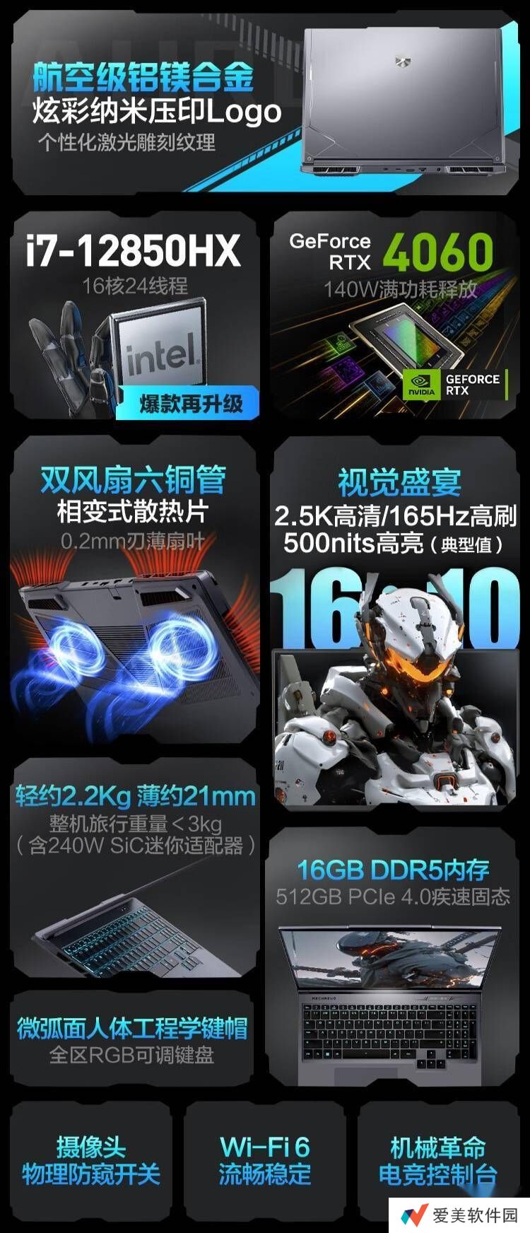 这款极光X游戏本的核心配置相当亮眼。它搭载了拥有16核心24线程的英特尔酷睿i7-12850HX处理器,为用户带来极致的多任务处理与游戏性能。同时,配备的140W RTX4060显卡,支持“双显三模”输出,无论是游戏还是图形处理,都能游刃有余。