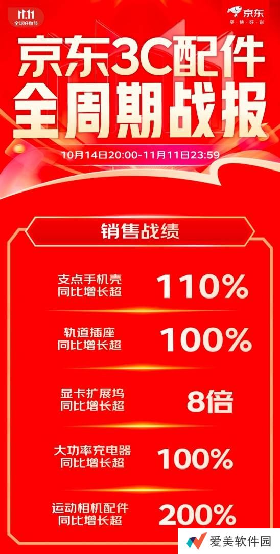 在京东11.11购物狂欢节中,3C配件品类凭借高效能、多功能的特点,吸引了大量消费者目光,呈现出强劲的销售增长态势。据战报数据显示,自10月14日20:00至11月11日23:59,多款产品成交额实现显著增长。