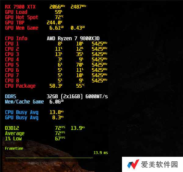CapframeX在游戏测试中的表现尤为出色,它能够展示一系列详尽的性能指标,包括CPU各核心及整体的频率、占用率、工作时间,显卡的工作时间、占用率、热点温度、功耗、显存占用等,以及内存的频率和占用率。它还能够提供平均帧率和帧时间等关键数据,是玩家进行游戏性能调优不可或缺的利器。
