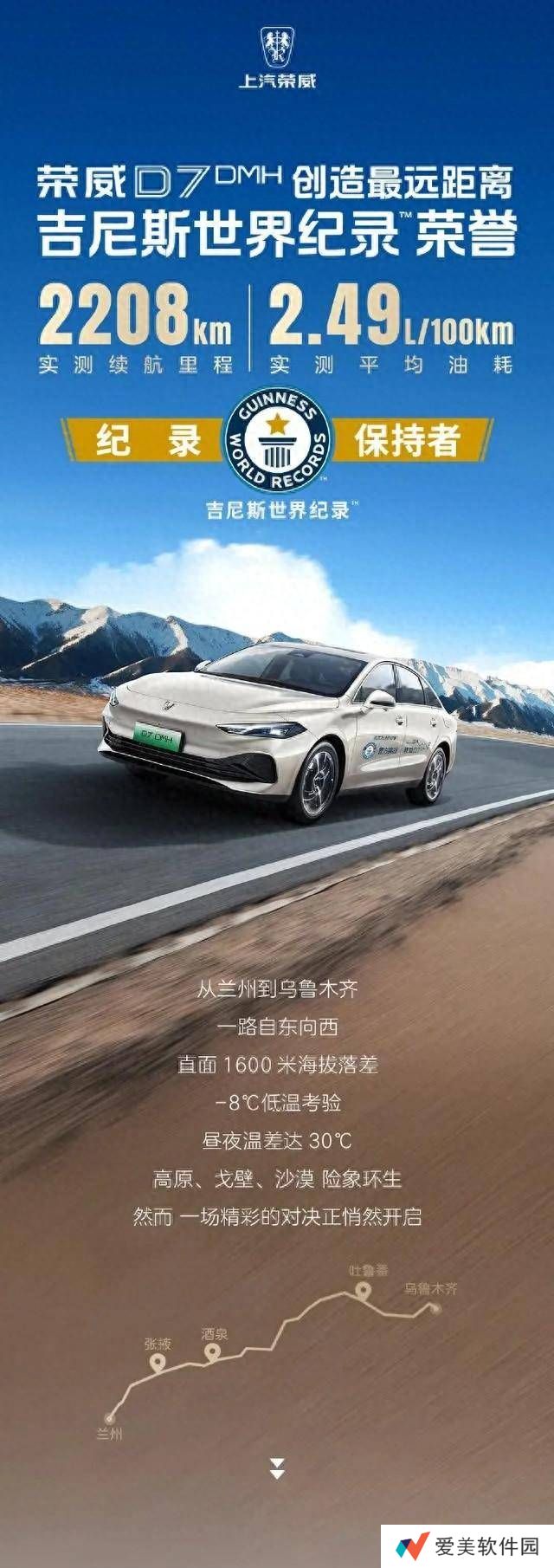 荣威D7 DMH世界冠军版近日正式上市,其背后隐藏的一项非凡成就或许还未被广大消费者所察觉:这款车成功创造了插电式混合动力轿车单次满电满油行驶最远距离的吉尼斯世界纪录,续航里程超过2208.719公里,平均油耗仅为2.49L/100km。