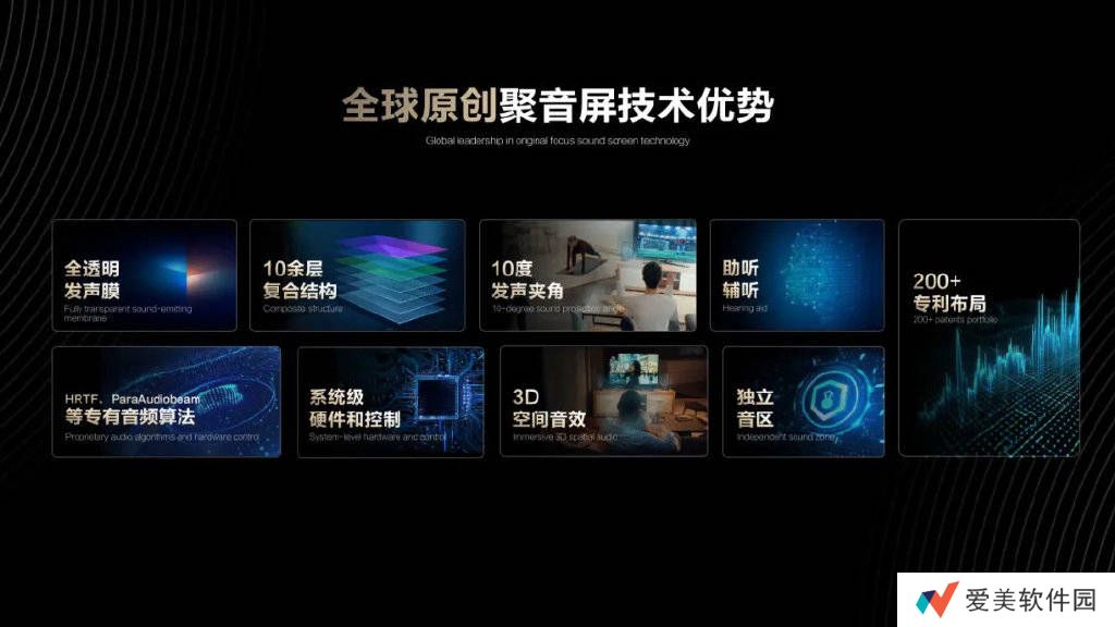 作为定向发声技术的全球领导者,清听声学发明了最新一代定向发声技术——聚音屏Focusound Screen®,并成为全球专利所有者。聚音屏技术通过全透明复合薄膜作为发声单元,与显示屏幕集成,实现“屏幕定向发声”及发声方向和角度的动态控制,为用户带来全新的视听及语音交互体验。