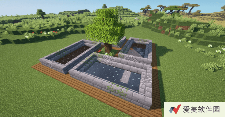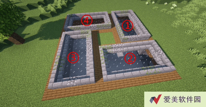 然后我们在云杉木板外围的两格处交替使用苔石墙、圆石墙、安山岩墙以及云杉栅栏门做出一个围墙,围墙上放置灯笼并且墙内的草方块上撒上骨粉